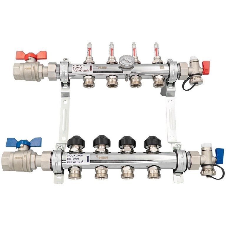 Коллектор для тёплого пола с расходомерами РЕХАУ HKV-D изготавливается из нержавеющей стали и предназначен для систем 2-контурного напольного отопления. Снабжён вентильными