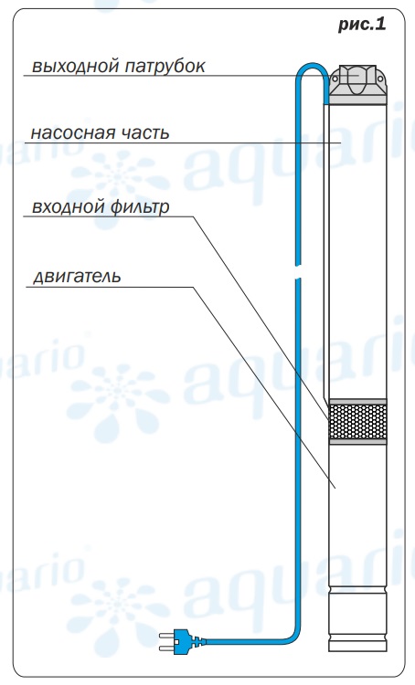 • Двигатель насоса - асинхронный, герметичный маслозаполненный со встроенным конденсатором и термовыключателем .
