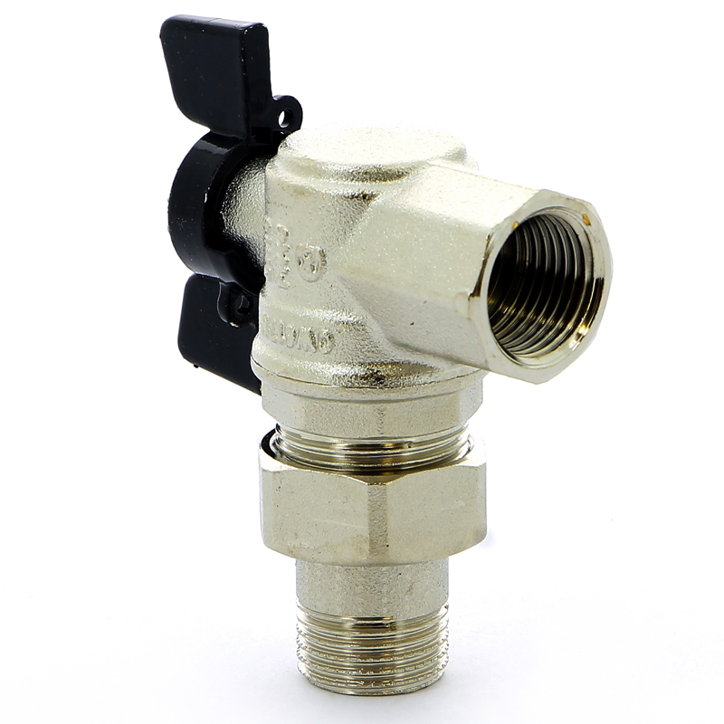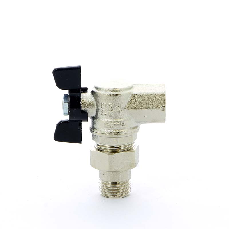 Кран шаровой латунный, угловой, полнопроходной, резьбы внутренняя по ISO 7:2000 - накидная гайка по ISO 228/1