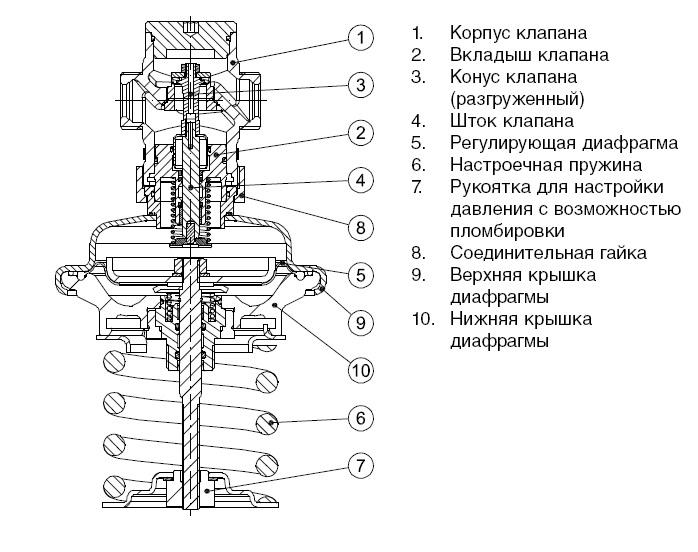 Регулятор автоматически поддерживает давление воды, изменяя проходное сечение клапана. При увеличении давления относительно заданного значения — регулятор автоматически открывается до тех пор,