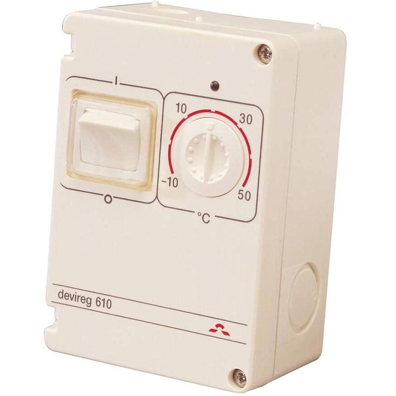 Терморегулятор Devireg™ 610 с диапазоном температур от -10°C до +50°C используется для установок внутри и снаружи помещения. Особенность этого терморегулятора — возможность его установки