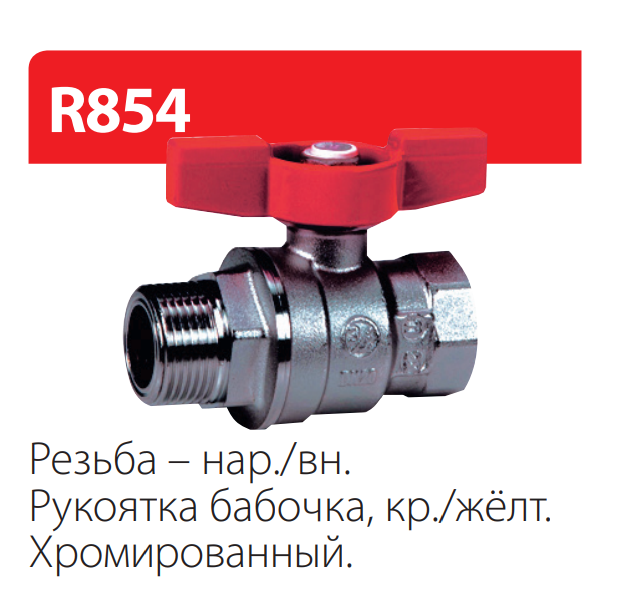 Кран шаровой резьба внутренняя/наружная, хромированный, ручка - бабочка красная.