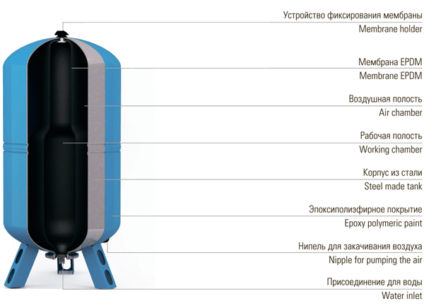 - Баки снабжены штуцером G для присоединения к системе водоснабжения, воздушным ниппелем для настройки давления в воздушной полости.