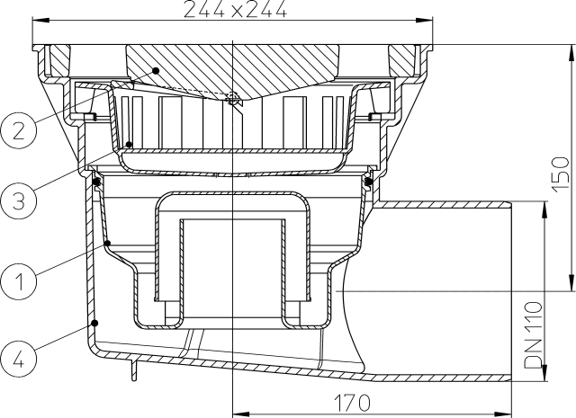 Трап с решеткой 226*226 мм в пластиковом подрамнике 244*244 мм, с грязеуловителем, высотой гидрозатвора 50мм и горизонтальным выпуском