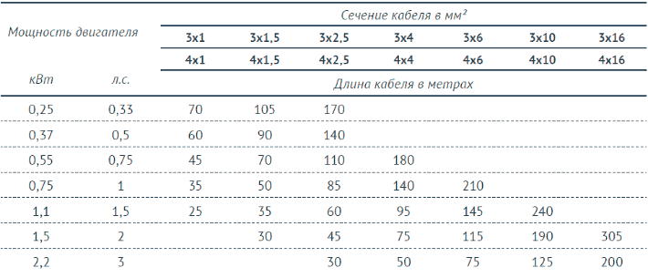 Сечение кабеля необходимо подбирать в зависимости от необходимой длины и мощности электродвигателя насоса, руководствуясь следующей таблицей: