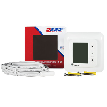 Energy TK02 Электронный терморегулятор с выносным термодатчиком и большим жидкокристаллическим дисплеем  предусматривает установку в стандартную электромонтажную коробку. Размеры терморегулятора соответствуют размерам выключателя «евростандарт», поэтому он может использоваться в стандартных единых монтажных рамках совместно с другими выключателями.