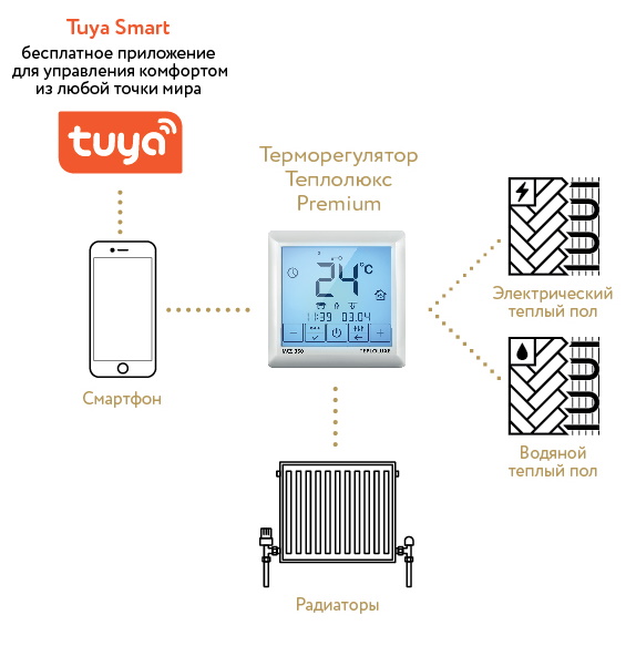 обогревом пола осуществляется по сети Wi-Fi напрямую со смартфона с установленным приложением TUYA или через домашний Wi-Fi роутер.