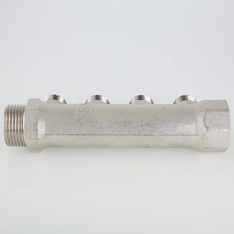 (VTc.500.N) Латунный никелированный коллектор на 2, 3 или 4 выхода диаметром 1/2" с наружной резьбой. Диаметр коллектора – 3/4 или 1", резьба – внутренняя/наружная. Рабочая температура теплоносителя – до 130 °С, давление – до 16 бар. Применяется для распределения потоков жидкостей в контурах теплого пола, радиаторного отопления, холодного и горячего водоснабжения.