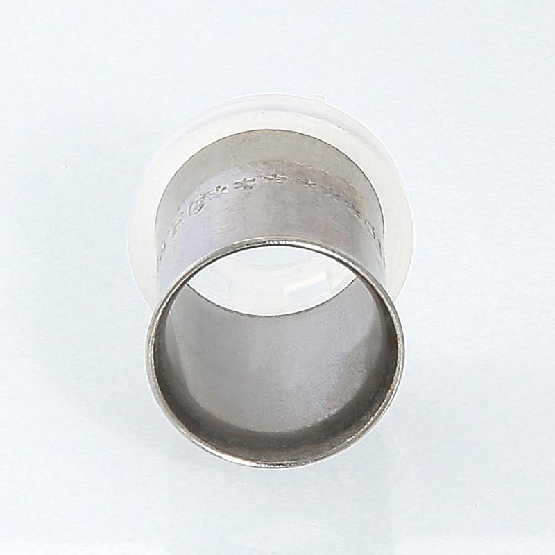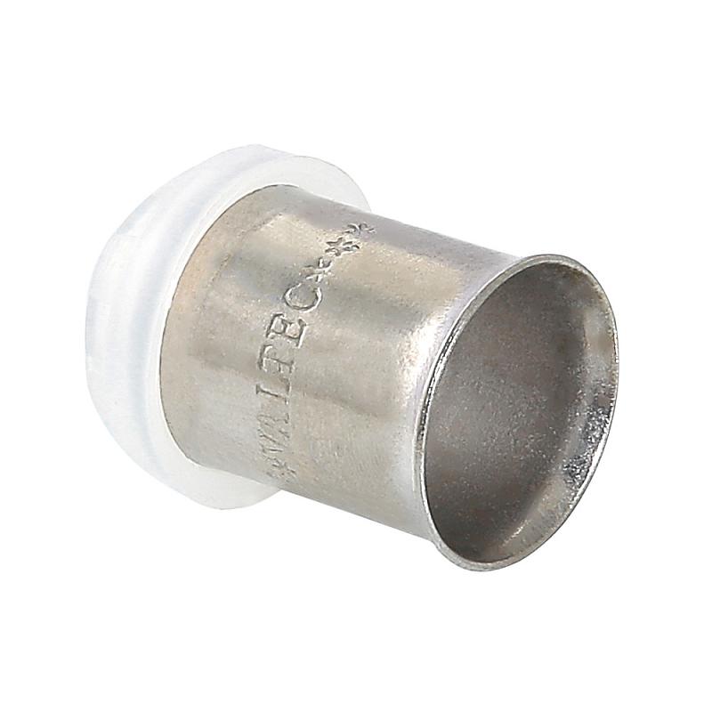 (VTm.290.N) Гильза с обоймой-фиксатором для пресс-фитинга VALTEC. Материал гильзы – пластичная нержавеющая сталь марки AISI 304, обоймы-фиксатора – нейлон PA 6. Гильза имеет монтажный раструб. Конструкция фиксатора обеспечивает правильное расположение пресс-насадки инструмента на соединителе, контроль полноты одевания металлополимерной трубы на штуцер, отсутствие электрического контакта алюминиевой прослойки трубы и латунного корпуса фитинга. Усилие обжатия гильзы – не более 1200 Н.
