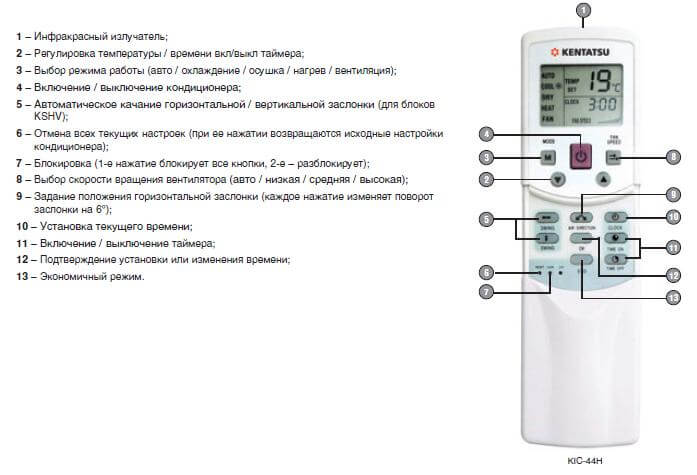 • новый дистанционный пульт управления KIC-44H в комплекте. Удобен тем, что снабжен сдвижной крышкой, которая при перемещении по направляющим вниз открывает доступ к восьми кнопкам. После выставления режимов с их использованием можно ее закрыть, оставив доступными только основные кнопки.
